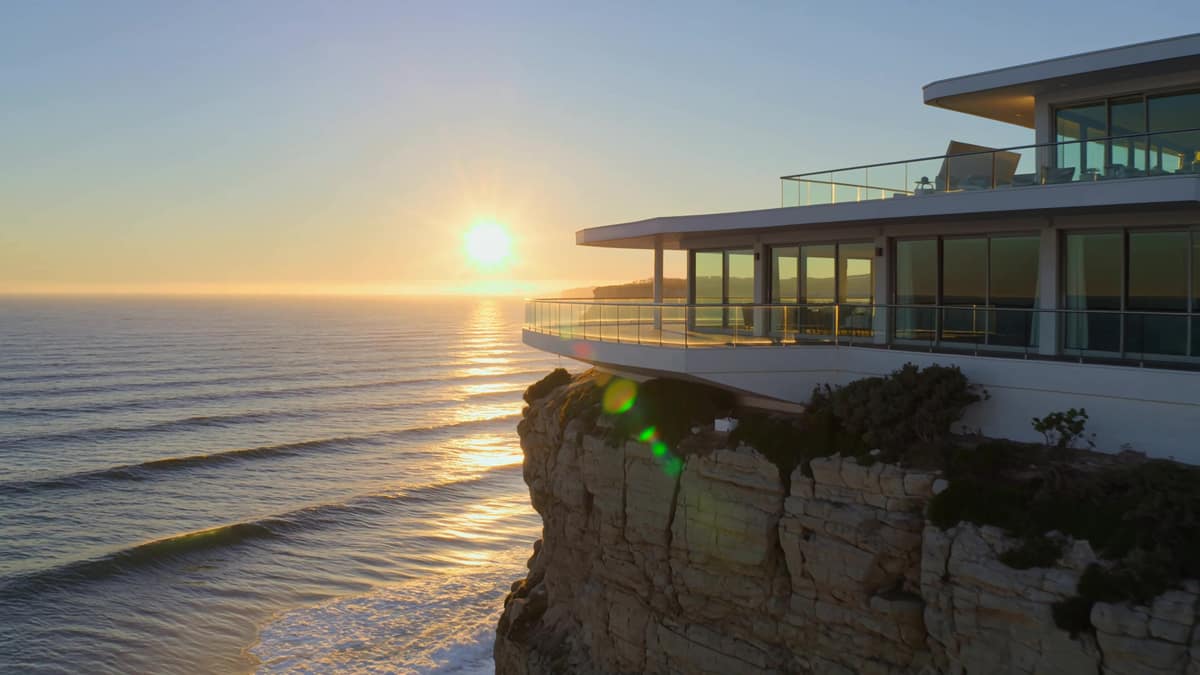 Native 4K campaign master shot, 16:9. Sunrise over a modern cliffside hotel above the ocean, smooth drone glide toward a glass terrace where warm light reflects on water and architecture. Subtle ocean spray, clean atmos…