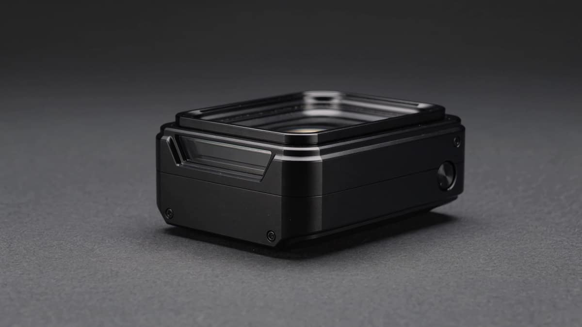 Native 4K cinematic product hero shot, 16:9. A premium black titanium camera device rests on a matte graphite surface in a controlled studio. Slow macro dolly push from left to right, crisp reflections across beveled ed…